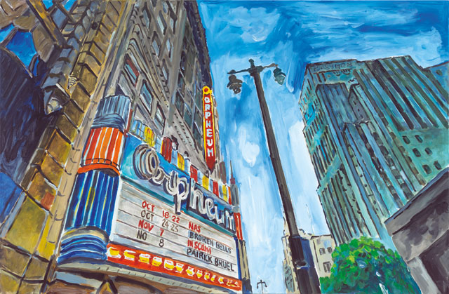 Il y a des scènes de sa maison à la Nouvelle Orléans. Il y a des peintures POV de lui en regardant le pont de Manhattan à New York. Il y a des scènes de rue que Dylan a entrevus alors qu'il était assis dans sa chambre d'hôtel. Il y a une image d'une cabane barbecue appelé Woody, sans doute un clin d'œil à l'un des héros de la musique de Dylan et l'homme qu'il magpied le plus dans sa jeunesse, Woody Guthrie. Il y a Alabama montre de côté, les voies ferrées, les voitures anciennes.